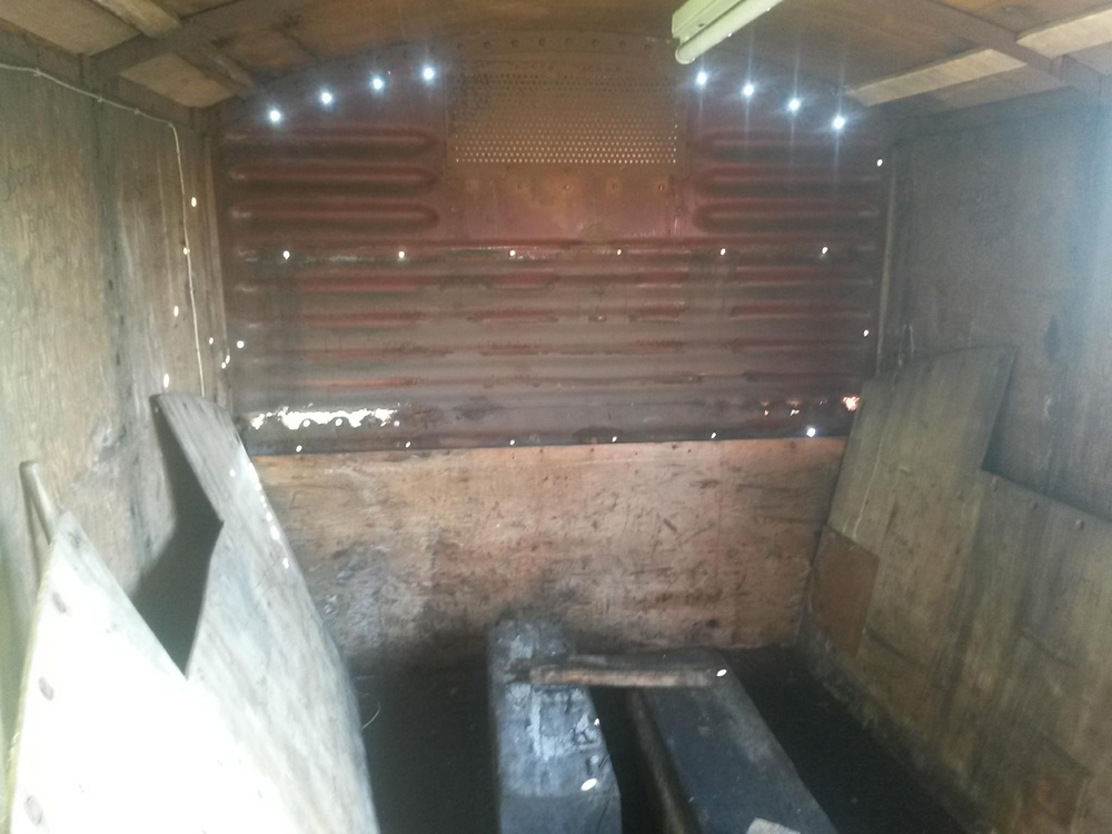The vehicle was stripped of all its wood and the extent of the water damage clearly visible.