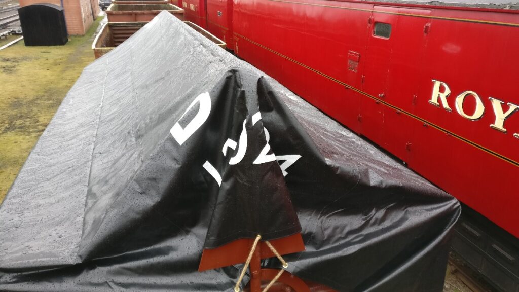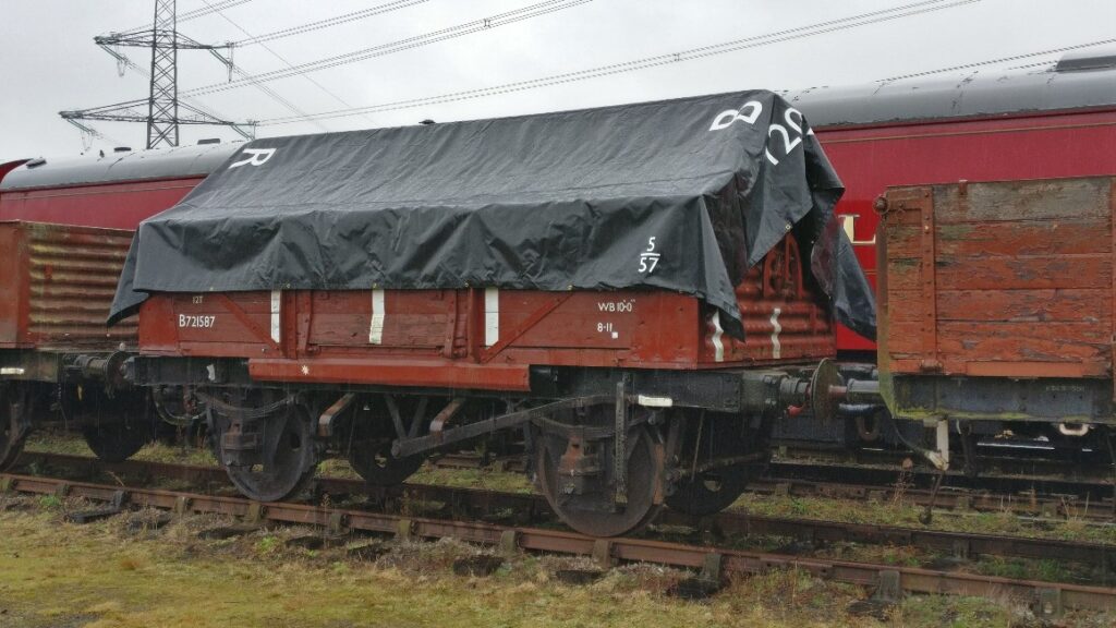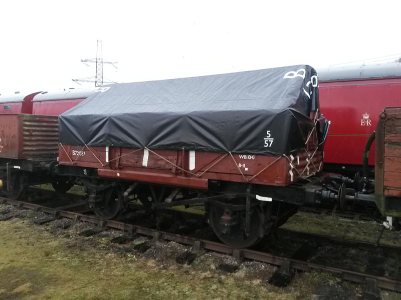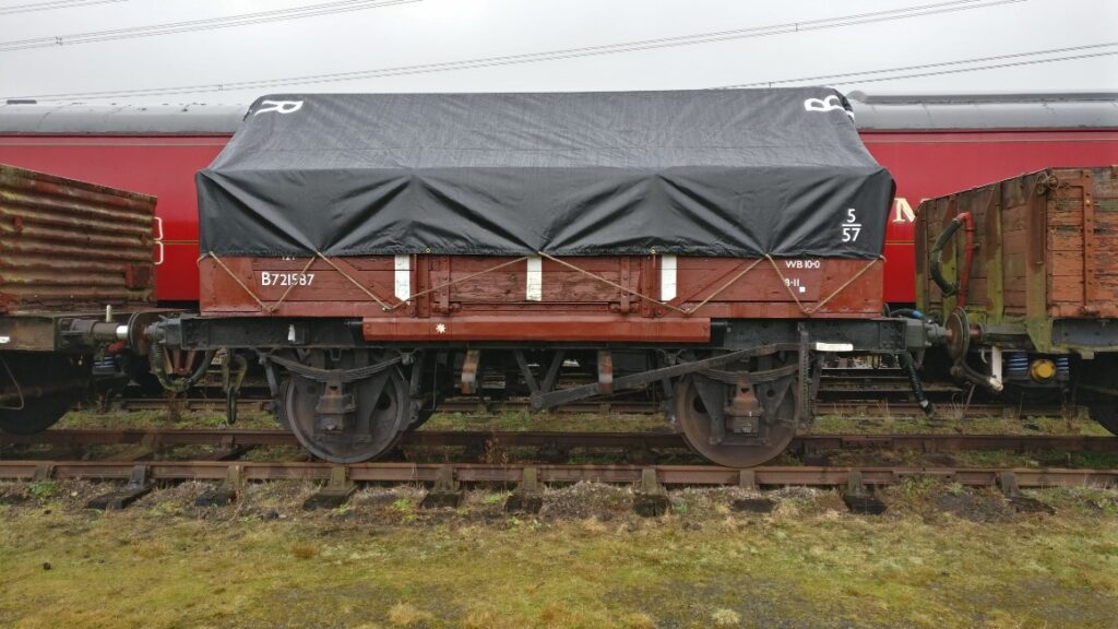 B721587 our Shock High fitted with a bar has now been fitted with a sheet. We would like to thank the Nene Valley Railway Wagon Department for their assistance in this project, specifically the dimensions and location of the lettering applied to the sheet.  Our sheet is numbered 120224 sequentially with theirs which is 120223.
