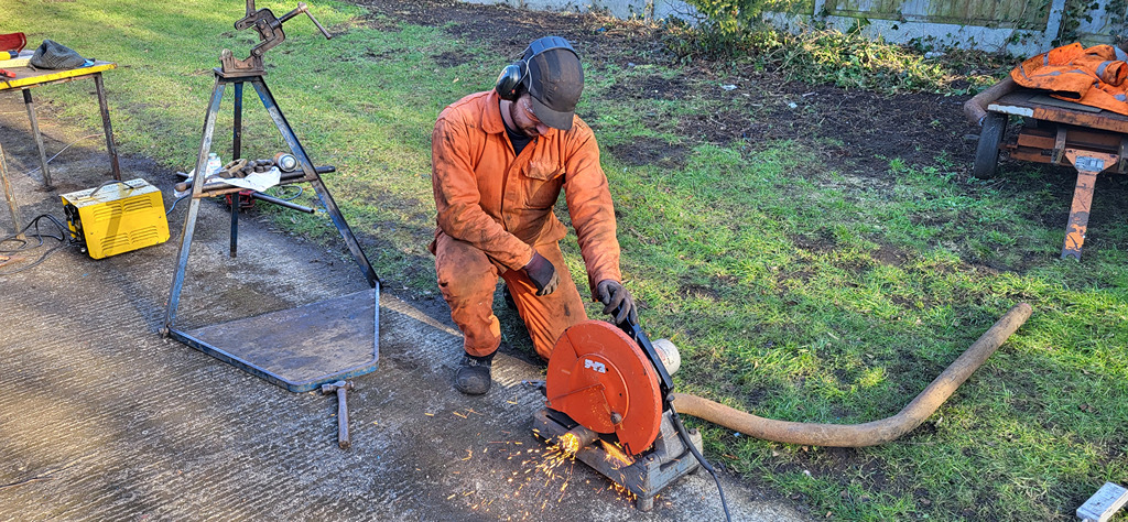 With my newly designed and 3d printed parts, I got the cut off saw working and ready to work. Dan and I used it to prepare some of the pipework found last week, cutting away the flame cut ends to square up them up.