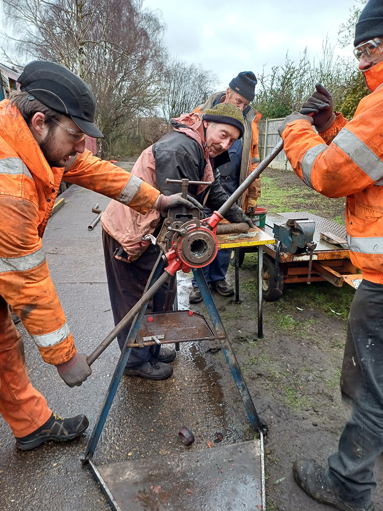Ernie and Nick started looking at the bits of pipe we have in stock to match them up to the pipe from 1802, then the pipe cutting and threading continued, with new recruit Harry having a go on the pipe threader.