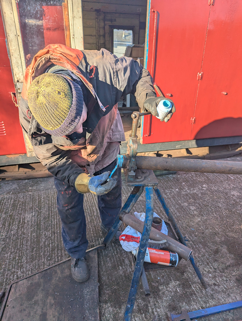 Nick, Charlie and James tidied up the bit of yard behind the signal box, and also adjusted the door to the grounded fish van. Dave drilled one of the trollies to mount a large vice as some of the piped were too short to hold and thread in the pipe vice.