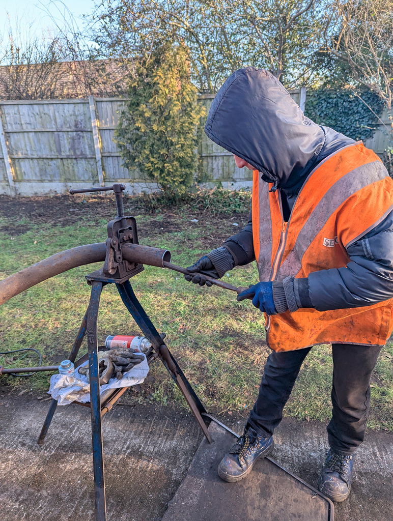 The straight piece of pipe over the south axle was measured, cut then fitted. Even Charlie had a go on the pipe threader…