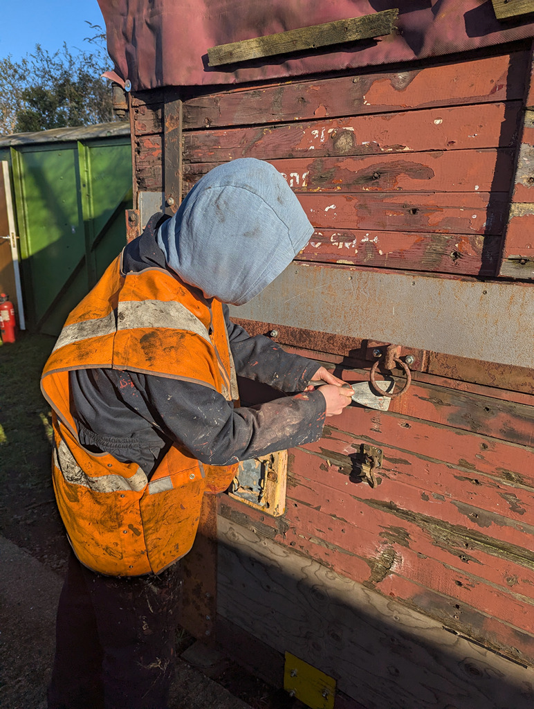 Mark, Tom and Nick did some more work on the south end of the GUV, re-fixing some of the hinge strapping back to the doors, and scrapping the iron and woodwork.