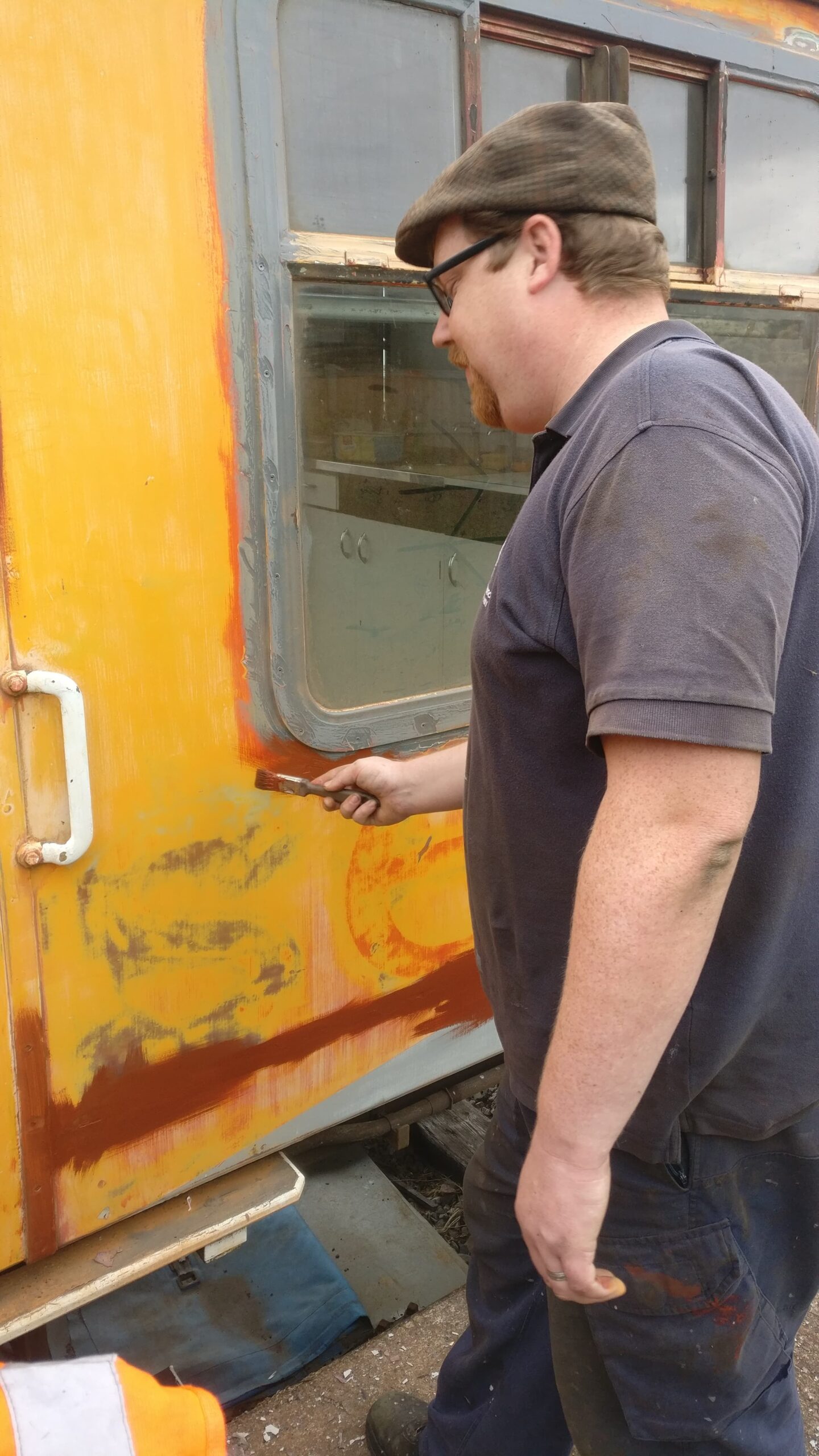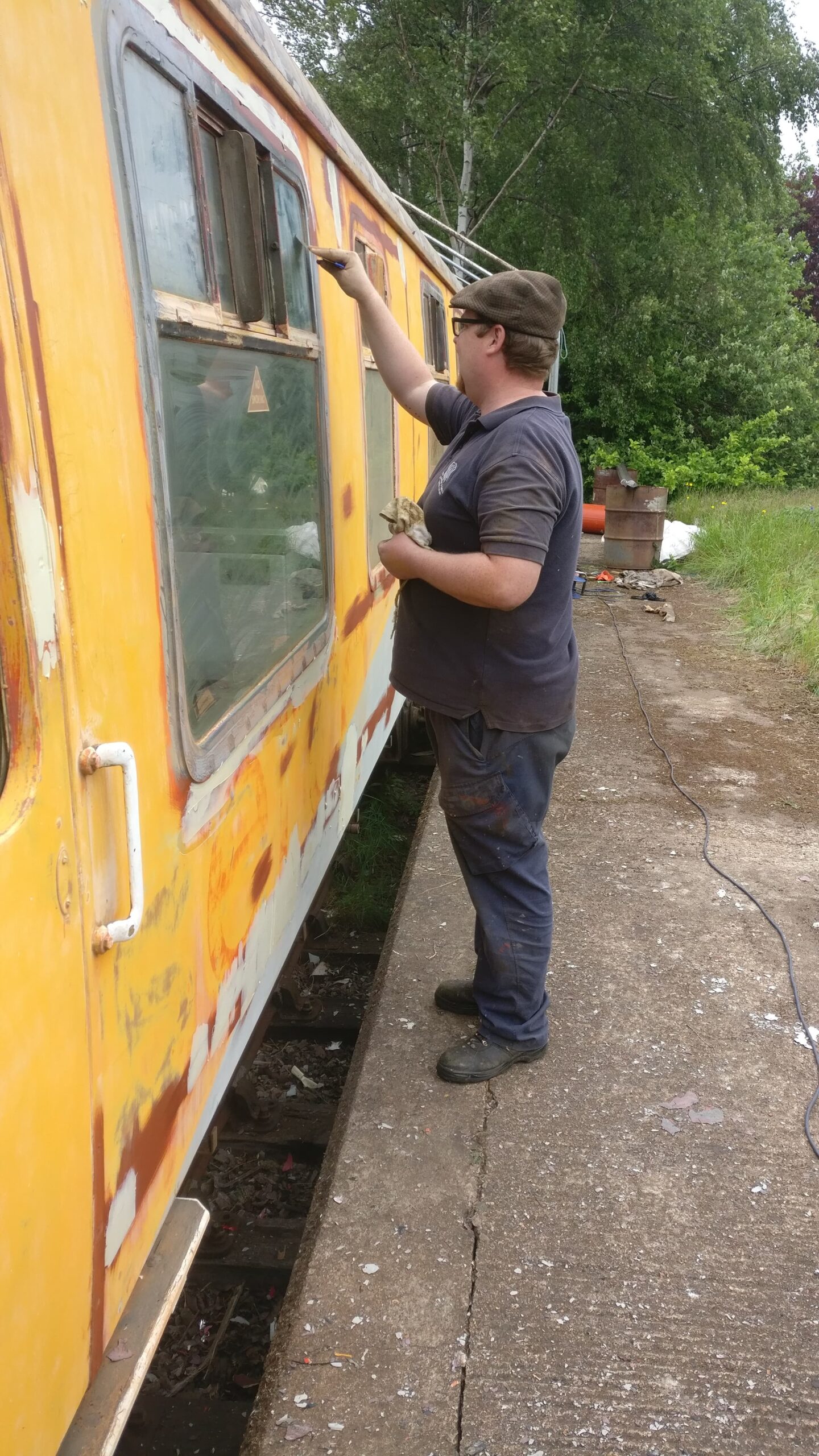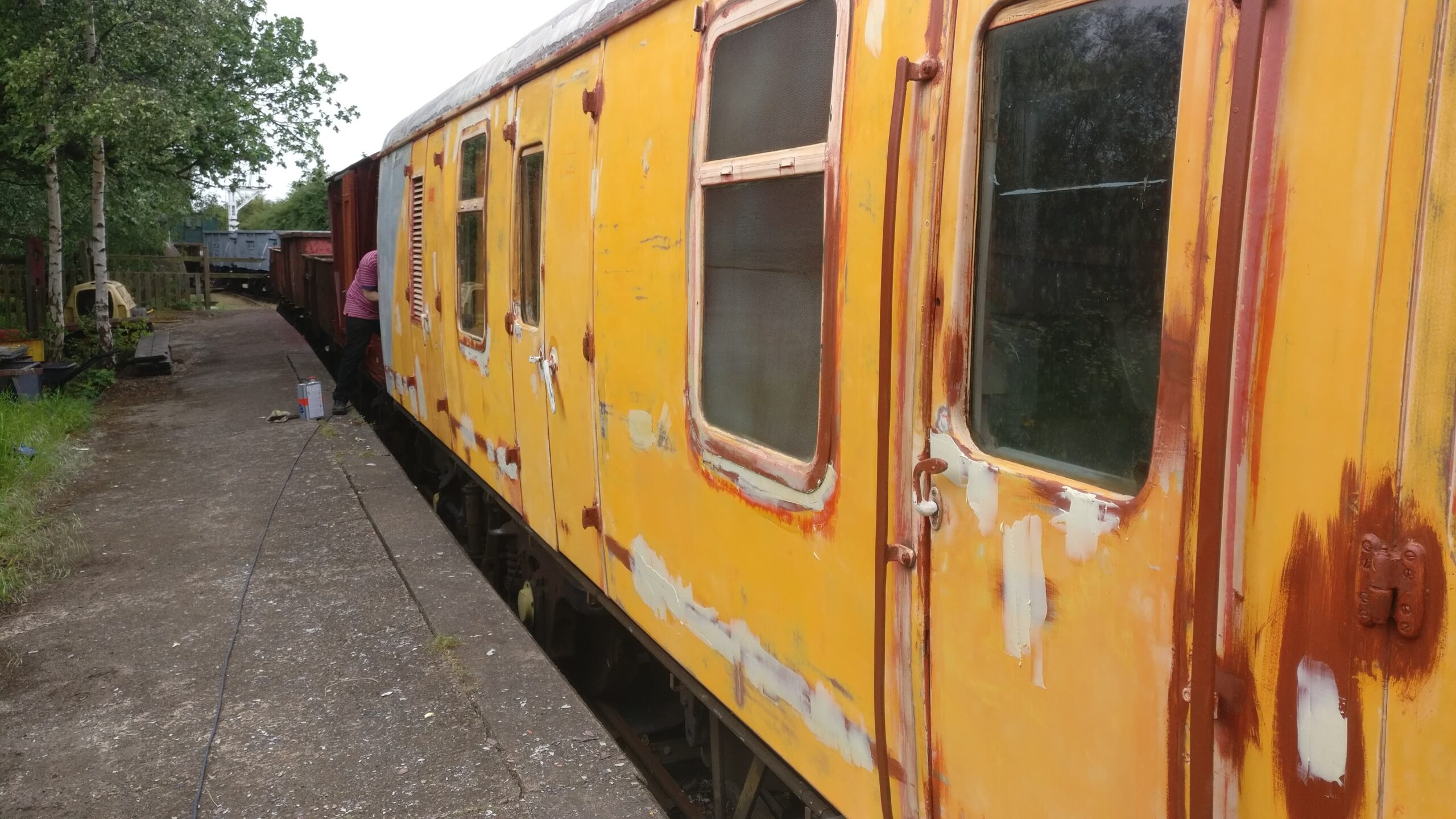 Sunday saw more work on the Yellow Coach. Dave worked on re-panelling the last area where there was a gas heater, in front of the guard’s office. Matt began by painting the boards he’d fitted last week. He then assisted me in cutting and fitting the conduit to the sockets. Eddie started cleaning the mess area, and has made a huge difference to the state of the walls. Nick concentrated on fitting the last window that had been welded up on Saturday (Thanks Jamie!). Dave finished off by painting the areas of bare metal welded in, and then fitting a bit of wood above the guards door, with its fire exit sign.