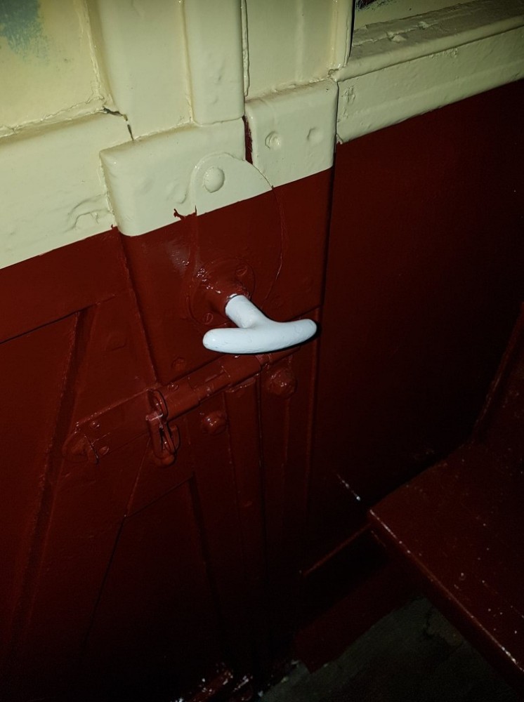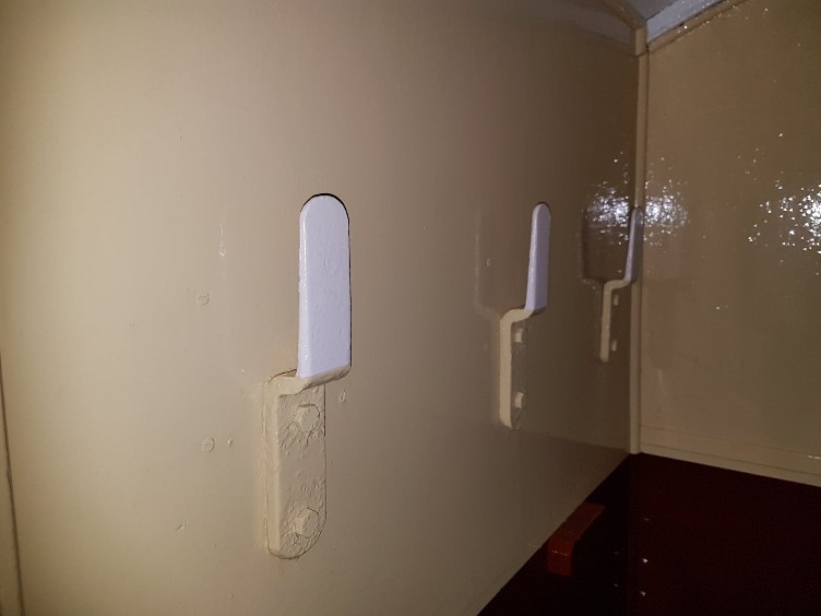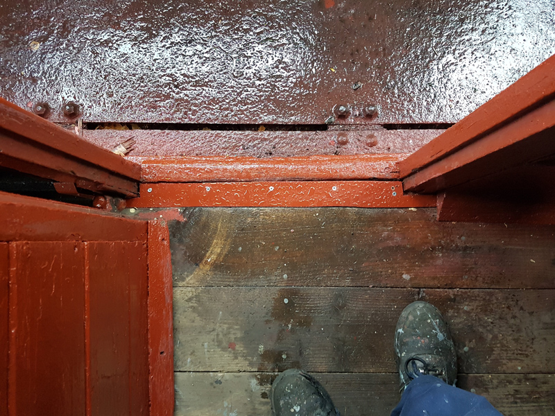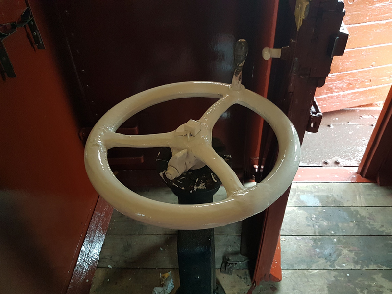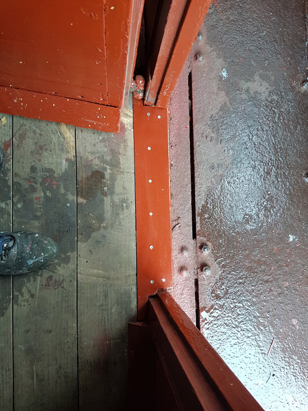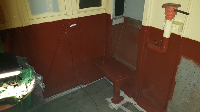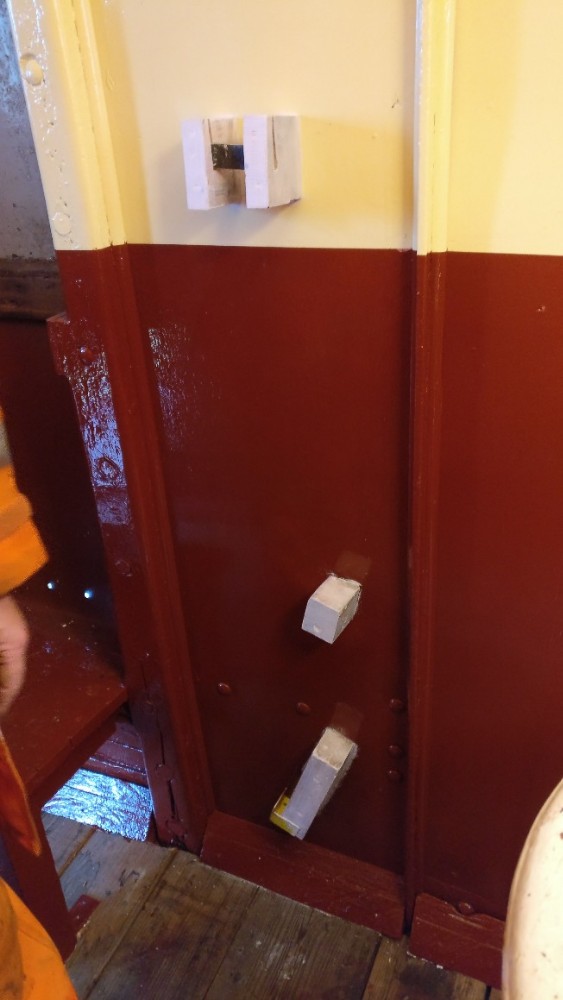 Whilst the air system was being removed the veranda doors and the corner noggings that include the door latches saw attention. All Noggings were removed and areas of built-up plate rust removed. A number of door repairs were also carried out most notably the South East Veranda door which Ross is particularly proud of, work included a lot of fine woodwork to get the door to fit up and close effortlessly.