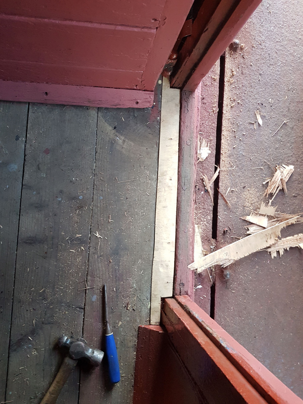 Sunday saw the same action taking place on the dockside, with 6 body planks being replaced there, and some of the interior plywood cut and fitted. Monday saw little jobs being undertaken, including refitting all the veranda door tops, lower floor quadrant cutting and fitting, filling strips manufacture, and a door plank to replicate and fit (I’m proud of that one, but took no pictures during the manufacture!)