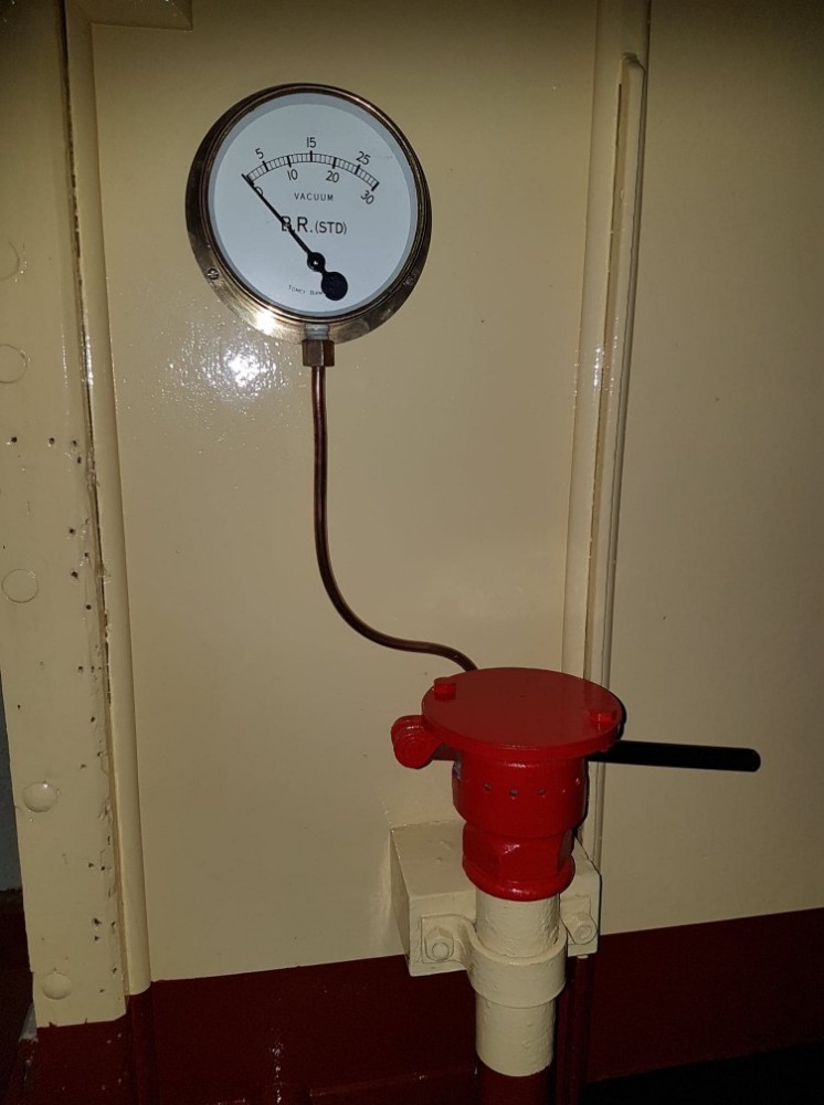 Unfortunately, a number of factors have prevented us from applying top coat the the SR brake van, mainly the weather. However Matt has continued in his crusade of detailing the interior of the van, completing the painting on the vacuum setter, the stove surround and making a mount for a shorting bar which we had in storage. Matt also refitted the vacuum gauge which had been polished previously. Some minor paint blisters have also been dealt with.
