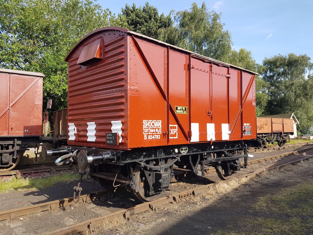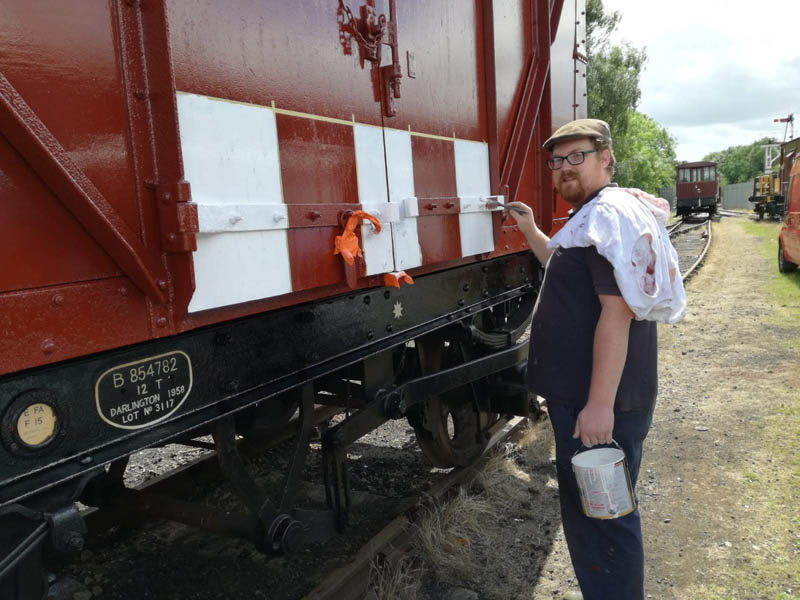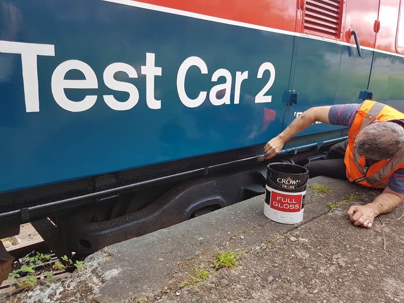 Matt was at work Saturday, but came down after work, and made a board so that we could stick our QWW magnet to something other than the newly painted Test Car. Matt also got out his signwriting brushes and picked out some details on the underframe of ‘2 car’ now that it has been turned.