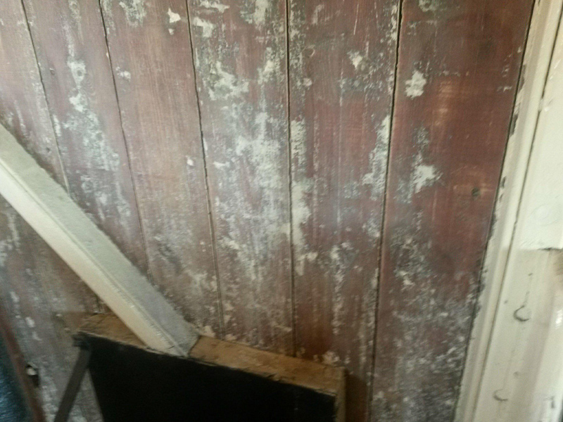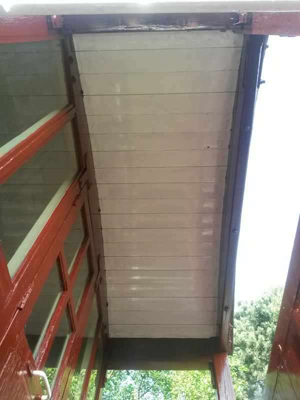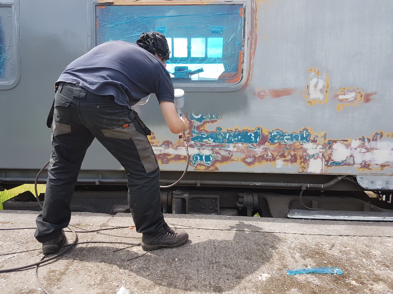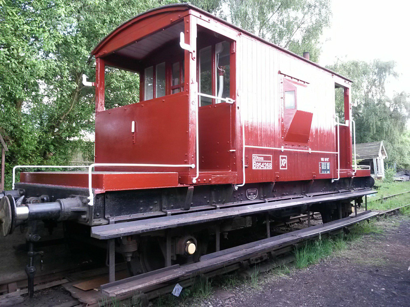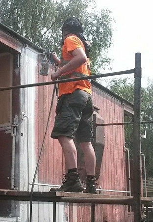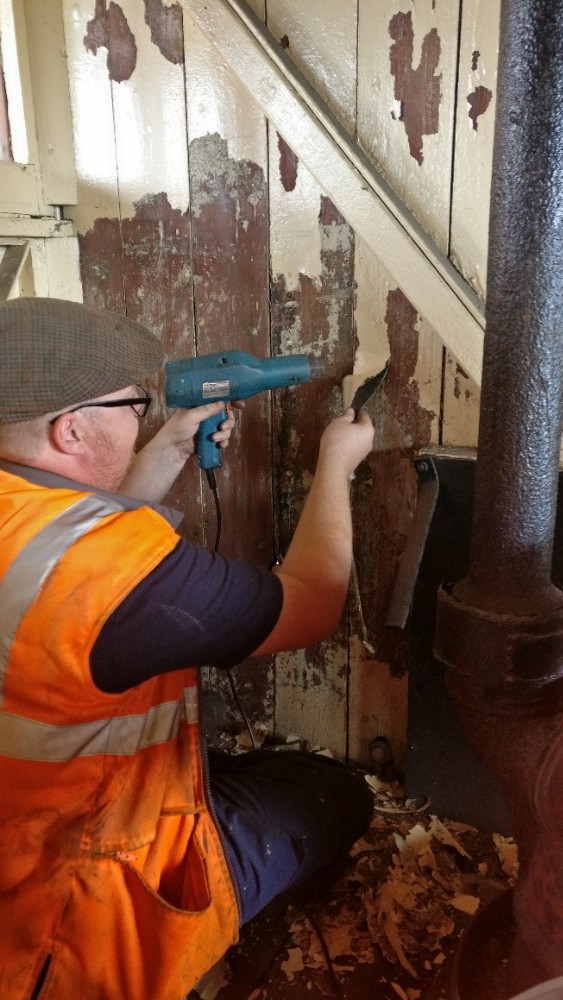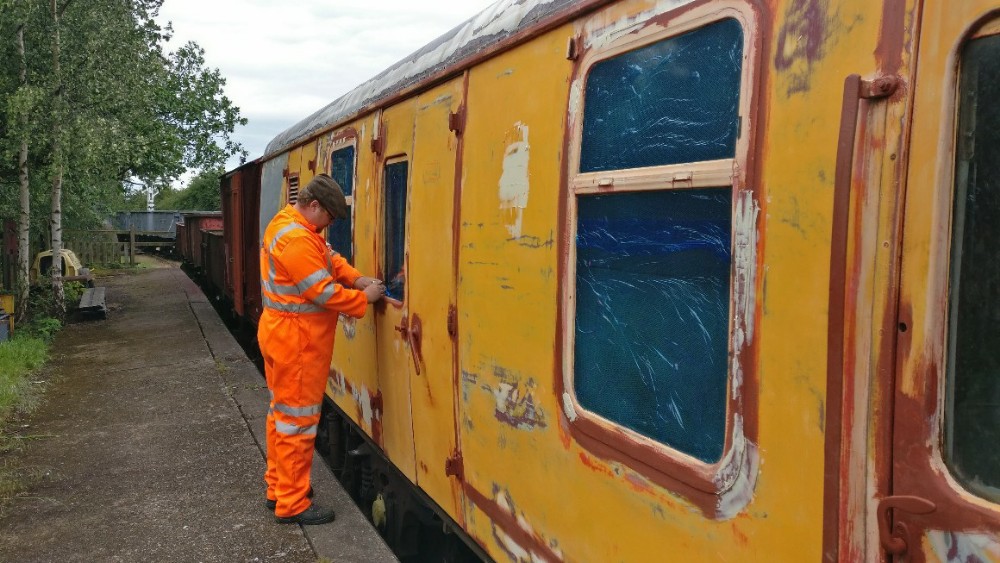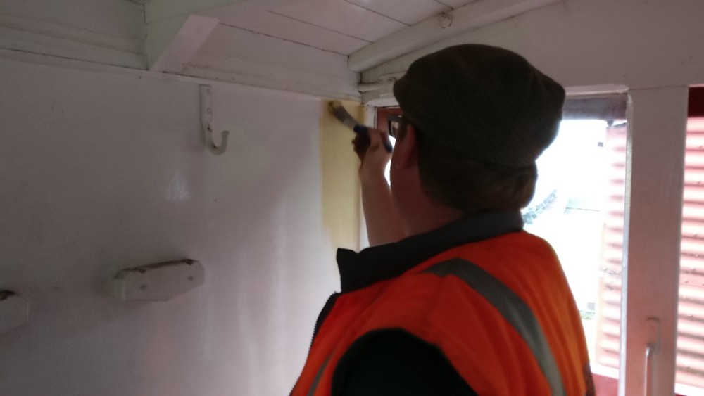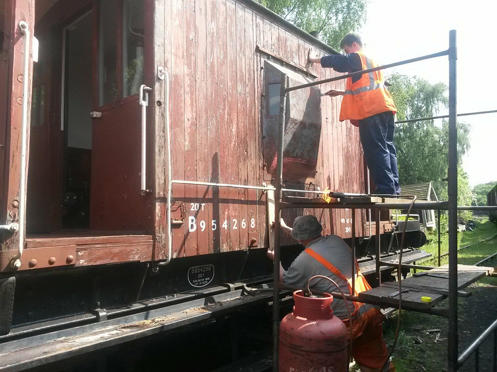 The bubbling paintwork on a few planks on the west side of Brake Van B954268 was sanded by Mark, Tom, Oliver & Dan, and the affected planks treated with undercoat.