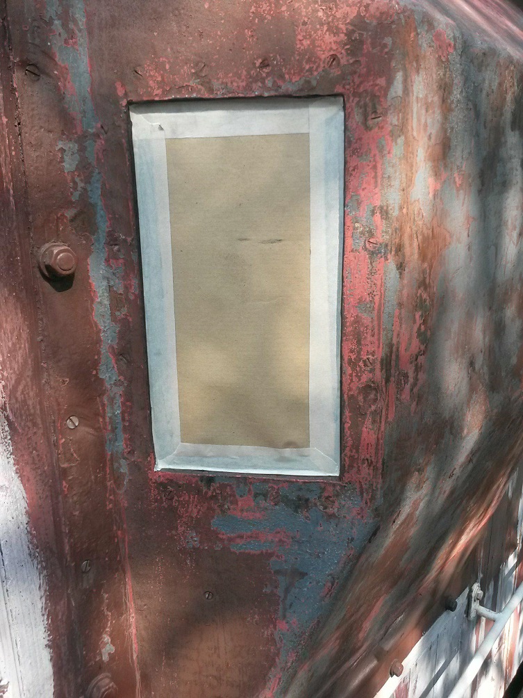Dave and I started off Sunday by marking out the logo squares on the barrel on the West side of the tank, starting by measuring heights and central positions, then getting the template onto the wagon to trace its outline before applying masking tape.