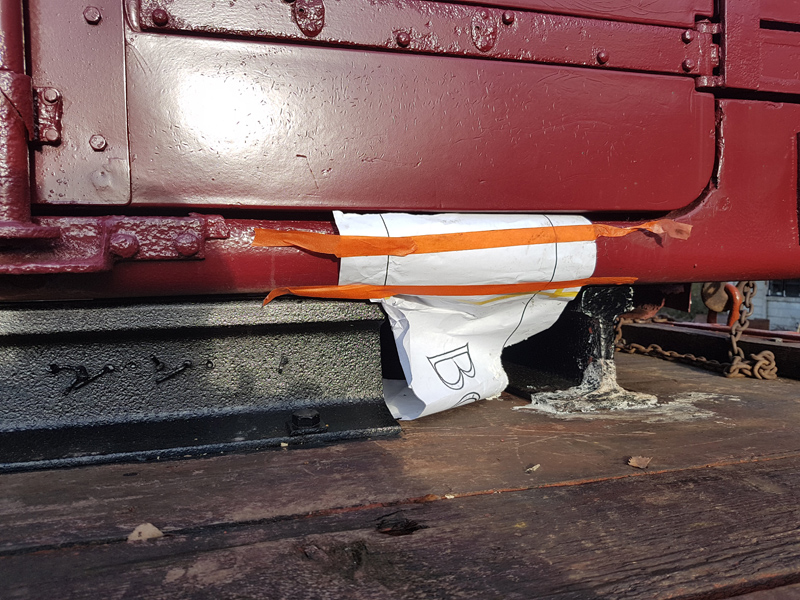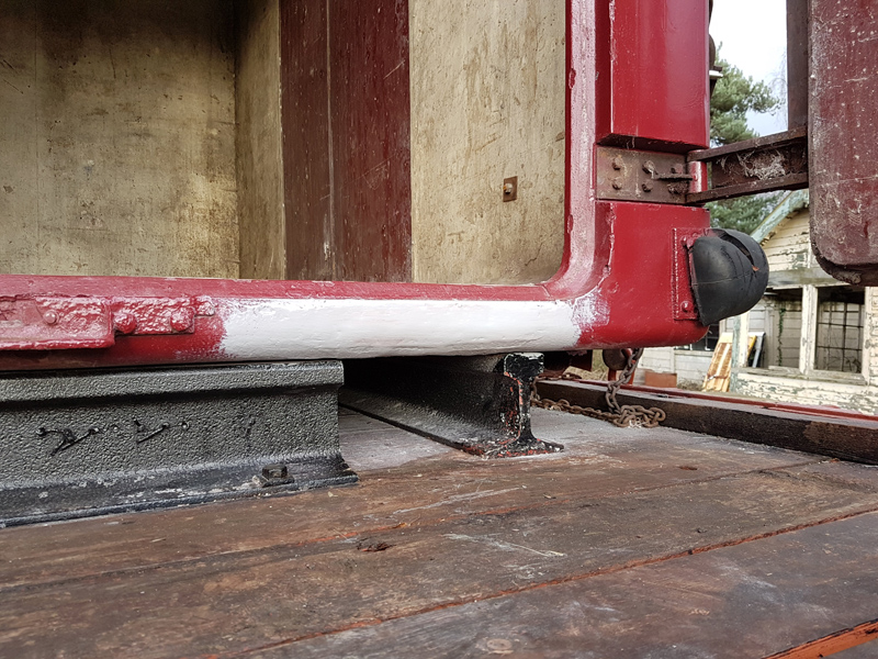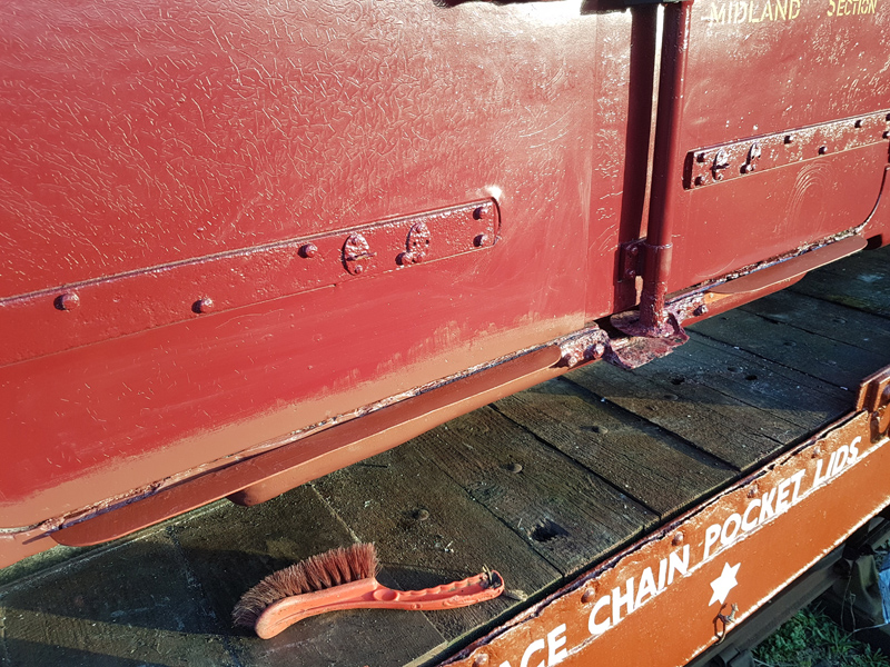 The east side solebar was black glossed by Nick and Charlie, whilst Ernie cleaned up and painted the vacuum pipe swan-necks & handbrake lever ends.