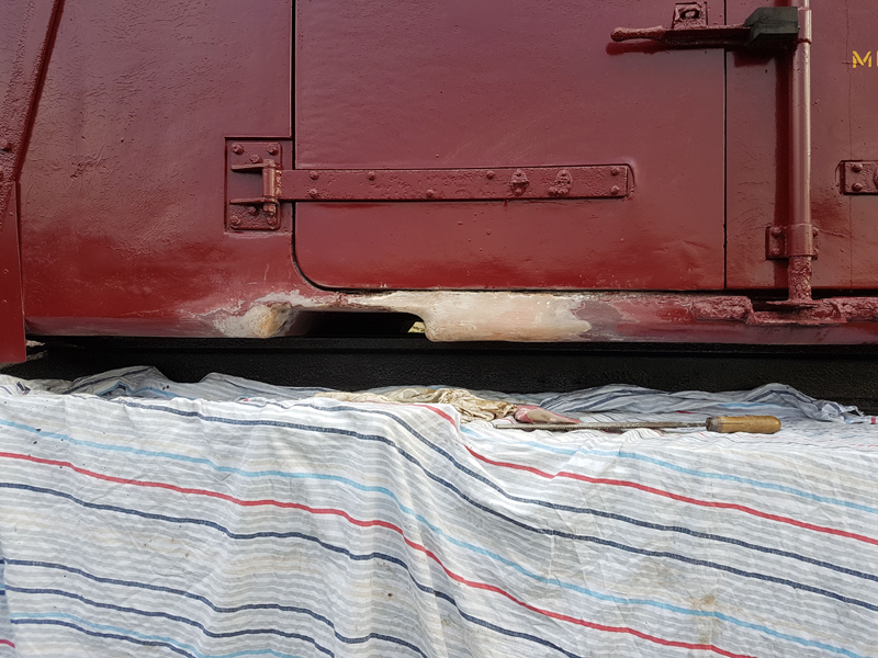 Mark, Tom, Oliver and Daniel progressed bodyside and underframe paint removal from the Lowfit using needle guns and scrapers. Red oxide primer was then applied to the prepared areas.