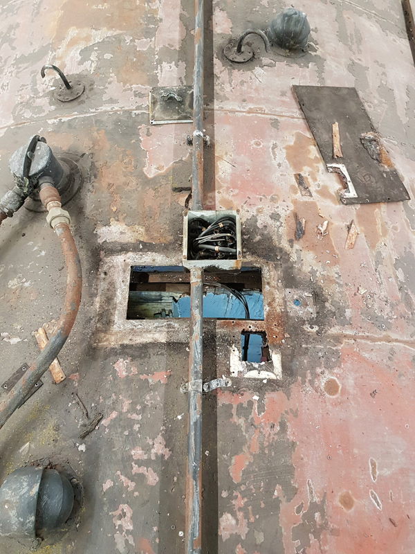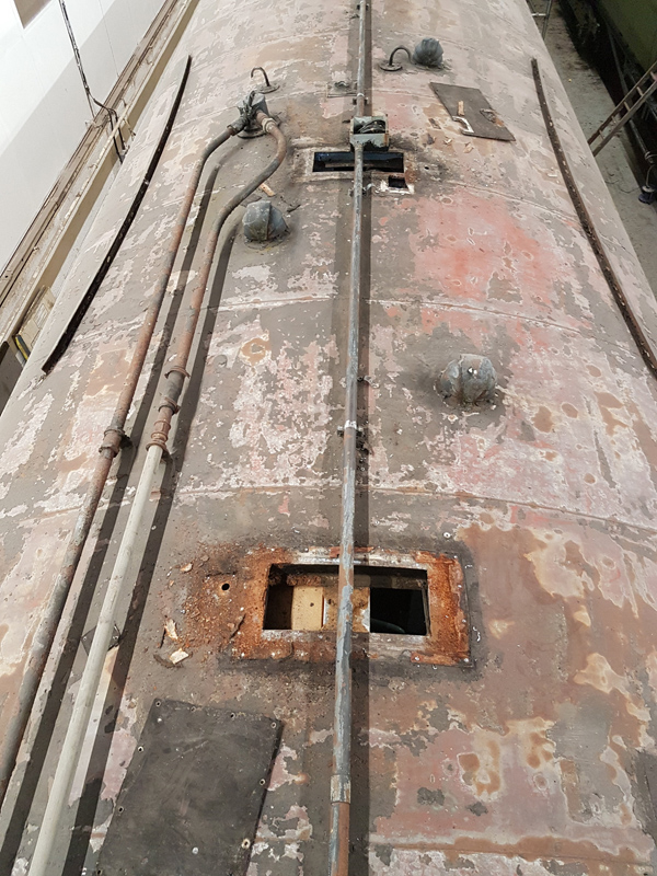 Dave’s attention was on the ceiling of the Guards compartment which had been damaged by water ingress. The remains of the old ceiling were removed, new baton affixed and were possible the previous ceiling panels reused.  Those that could not were either replaced or trimmed to be used elsewhere.20191228_184614.jpg I went on to the roof to find the source of the leaks although I had a really good idea.  As suspected the blanked off periscope holes were the culprits. I removed them but during its departmental conversion, the 110v feed was placed over one of the repair plates, this will need dismantling to ensure a good repair can be carried out.
