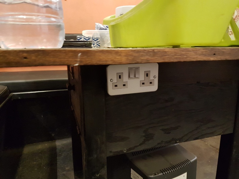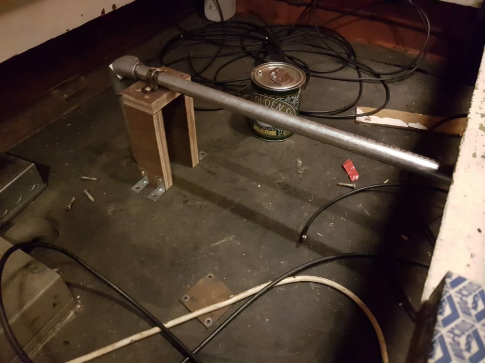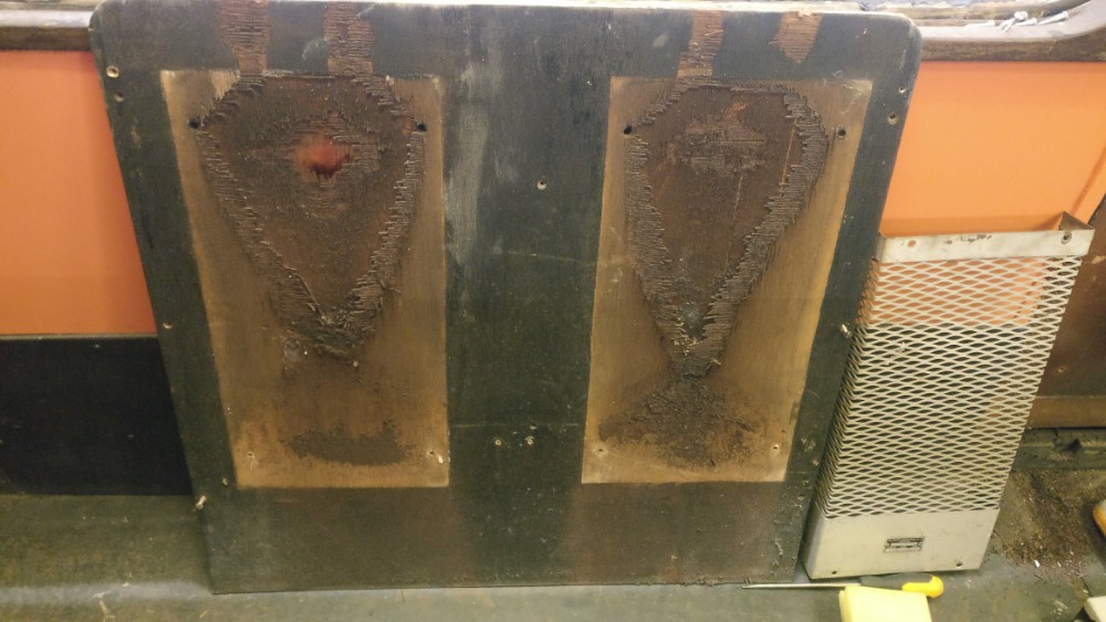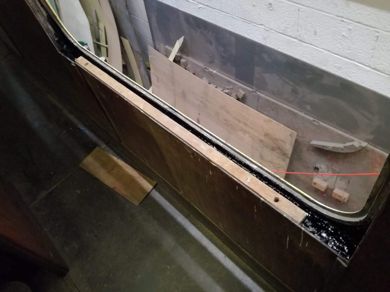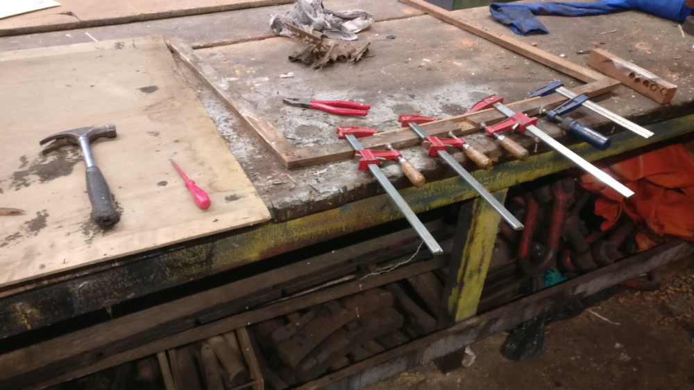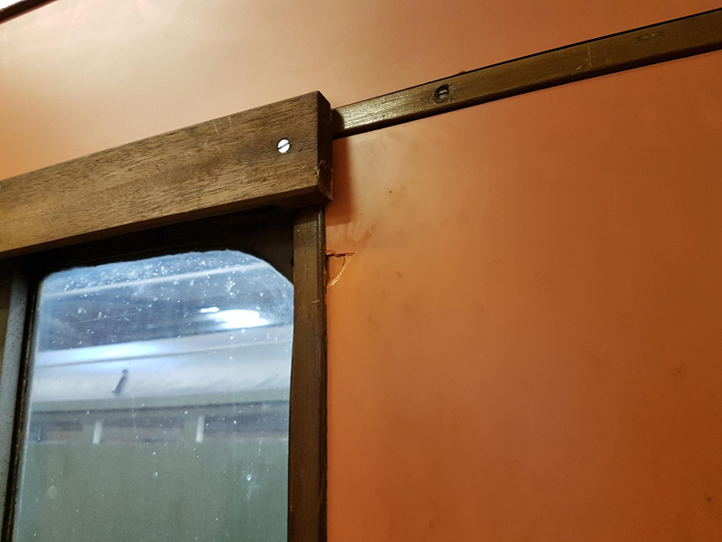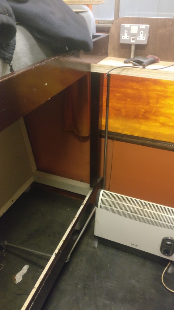 James helped me fix down the table top in the mess coach, finishing the preparation and spreading the glue contact adhesive on both surfaces. The Formica surface was lowered back onto the wood and then clamped and weighed down. I’m going to try and polish the Formica and the surrounding wood will get a coat of varnish too.
