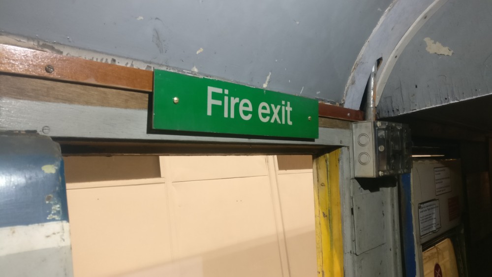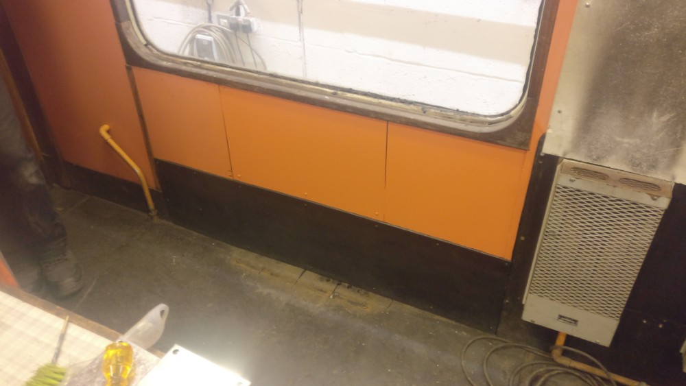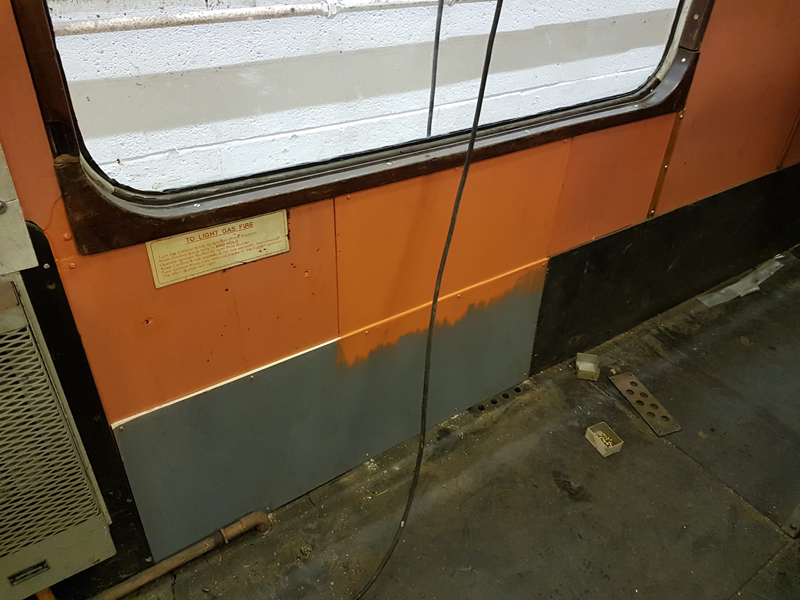 Sunday saw more work on the Yellow Coach. Dave worked on re-panelling the last area where there was a gas heater, in front of the guard’s office. Matt began by painting the boards he’d fitted last week. He then assisted me in cutting and fitting the conduit to the sockets. Eddie started cleaning the mess area, and has made a huge difference to the state of the walls. Nick concentrated on fitting the last window that had been welded up on Saturday (Thanks Jamie!). Dave finished off by painting the areas of bare metal welded in, and then fitting a bit of wood above the guards door, with its fire exit sign.