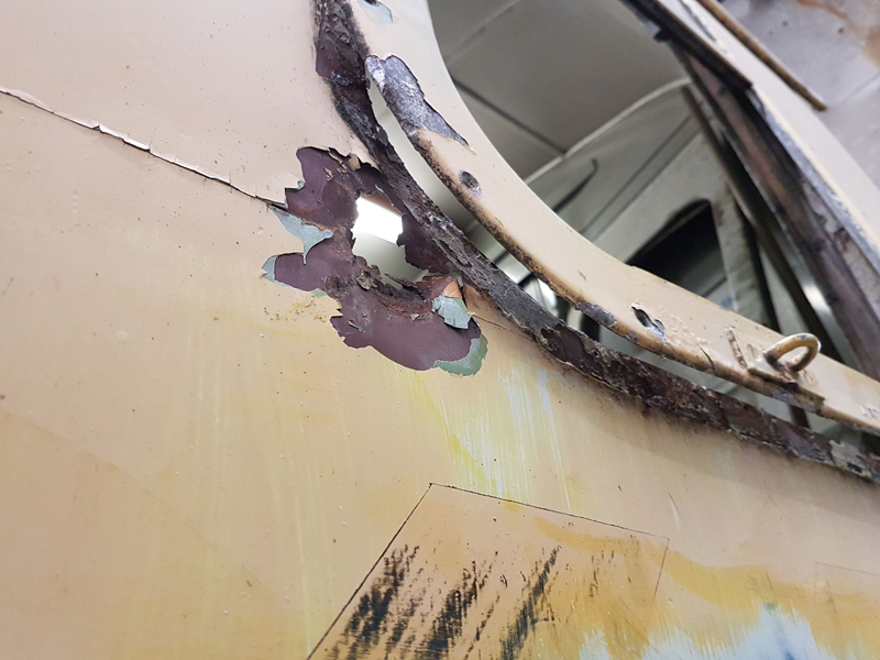 Once the paint was sufficiently dried we riveted the fork protectors under the side doors and applied undercoat.