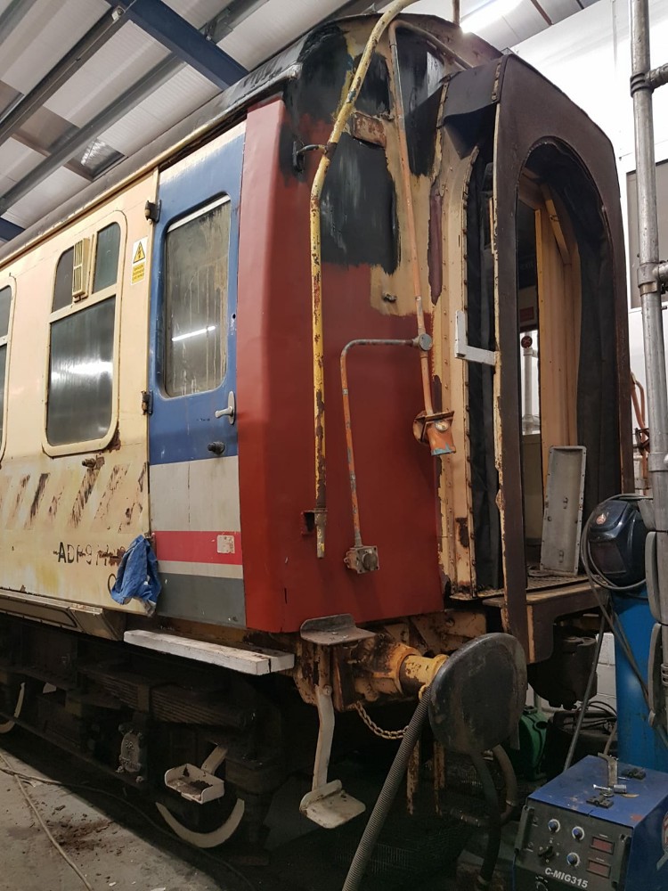 Sunday’s work concentrated back on ADB977107 at Rothley. Nick and I began by focusing on the south end interior paneling with required removal prior to welding. The end sheet steel has been tacked into place, but now requires seam welding. I took one of the ceiling panels out to the workbench to have the frame strengthened and the plywood panel fixed back to it.