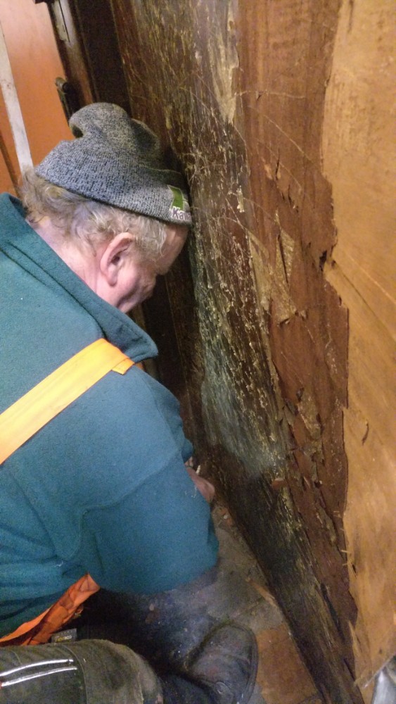 Matt started by sorting and tidying the bedroom, throwing out all the old clothes and detritus and making all the beds. Where the heaters had been removed, the paneling was removed and thrown out upon conversion. Matt manufactured some more and I fixed some timber battens to the Z irons for Matt to fix things too.
