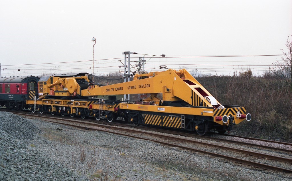 In addition to wagons, on-track plant and coaching stock were occasionally slip/brake tested, for example this Cowans Sheldon 75t breakdown crane needed testing after it was modified by fitting air brakes in 1987.