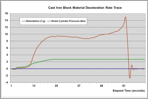 A deceleration meter fitted on the headstock of the wagon containing a calibrated accelerometer and a low pass filtered output onto a strip paper chart provided an accurate measure and characteristic of deceleration rate of the wagon throughout each slip/brake test.