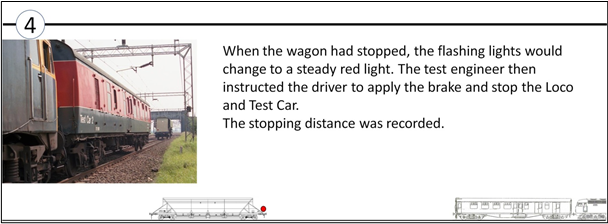 The test engineer calculated the wagon brake stopping distance for each slip/brake test run, taking the total distance from the point at which the brakes were applied on the wagon until the locomotive and test coach had stopped, then subtracting the distance the locomotive and test coach had to reverse back to collect the wagon. The results were plotted on a speed/distance graph.