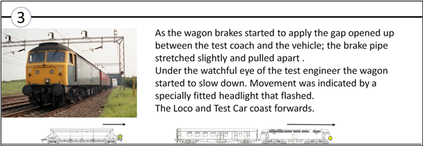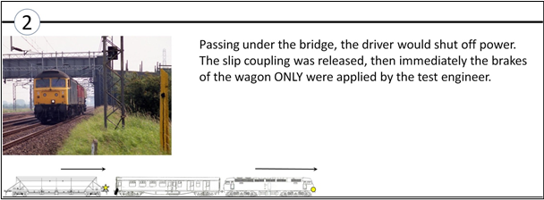 In addition to the slip coupling, the brake system on Test Car 2 was modified such that a test engineer could independently operate the brakes of the wagon under test without affecting the brakes of the test coach or locomotive which remained under the control of the driver.
