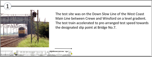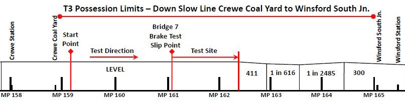 The slip/brake tests were normally carried out on the Down Slow line of the West Coast Main Line between Crewe and Winsford. To ensure safe operation a ‘T3’ possession of the Down Slow line was applied by the Crewe Coal Yard signalman, making sure it was blocked to all traffic and protected by stop boards and detonators at each end of the possession section.
