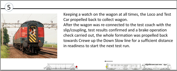 Tests were always carried out at varying speeds from 30 mile/h up to the maximum operating speed of the vehicle under test. On average 15 slip/brake test runs could be completed during a day’s testing, however the achievable number of tests varied depending on how slick the team on board was working, the type of locomotive, the performance of the wagon under test, and more often than not, the weather.