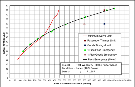 The stopping distance limit in 1987 for a wagon running at 75 mile/h was 951metres, the graph below shows test results just failing to meet this, therefore this wagon would have been subject to modification to the brake system before a retest.