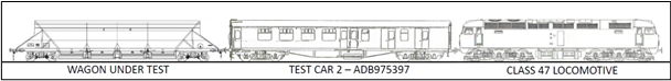 A typical slip/brake test train would consist of a locomotive, Test Car 2 and the wagon under test. Class 47 locomotives were preferred for the slip/brake testing, not just because they had adequate power to accelerate quickly; also, the responsiveness of the engine control system of the Sulzer locos (compared to the English Electric locos) made it easier for the driver to control the speed more accurately with the short and often light trailing load of a test train.