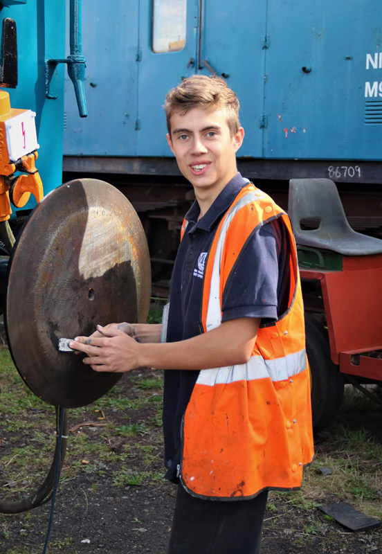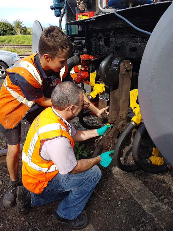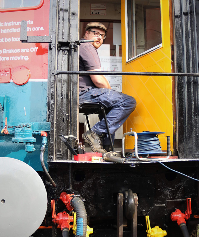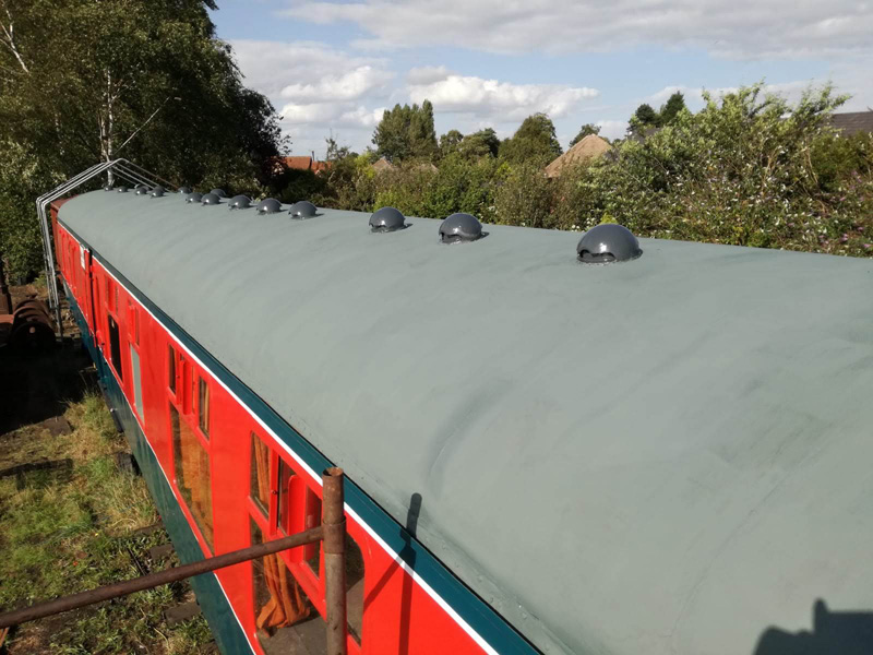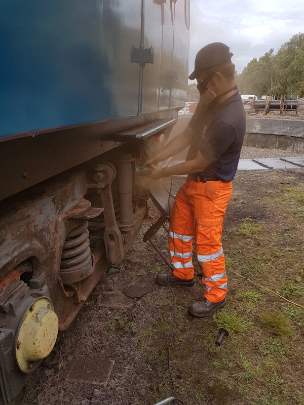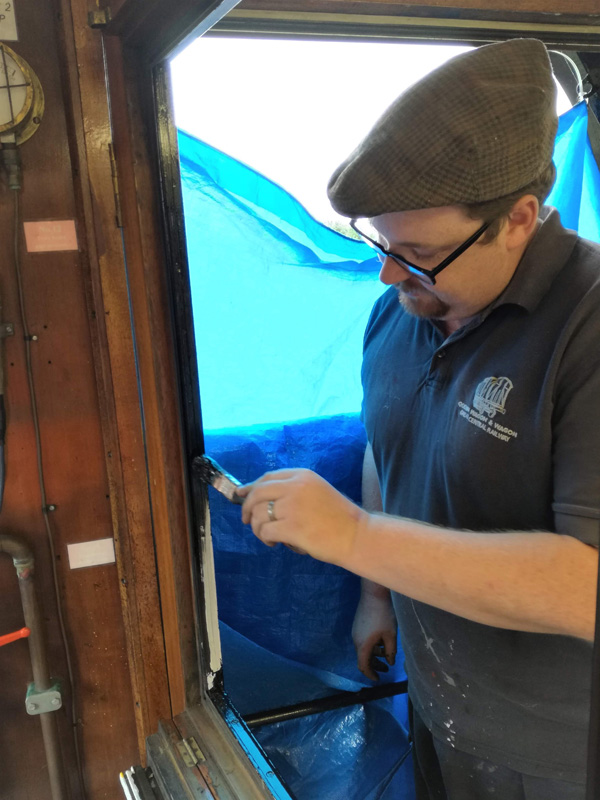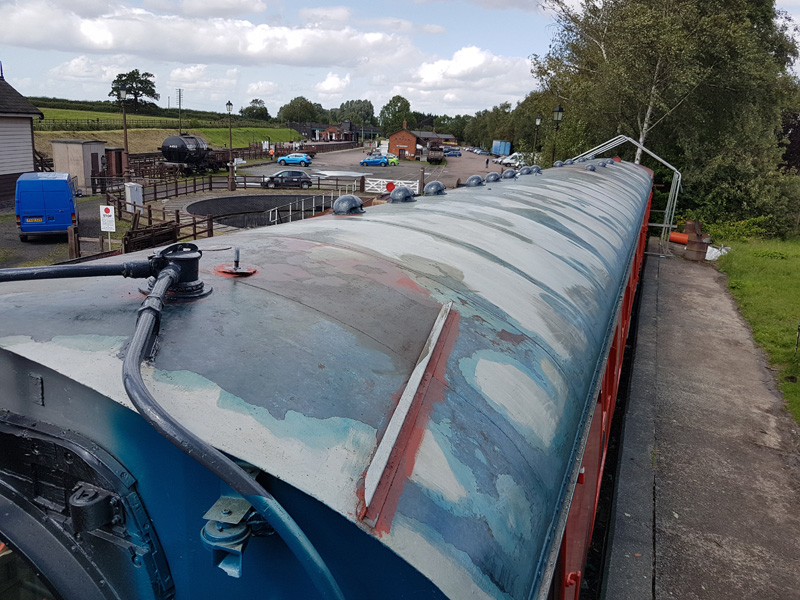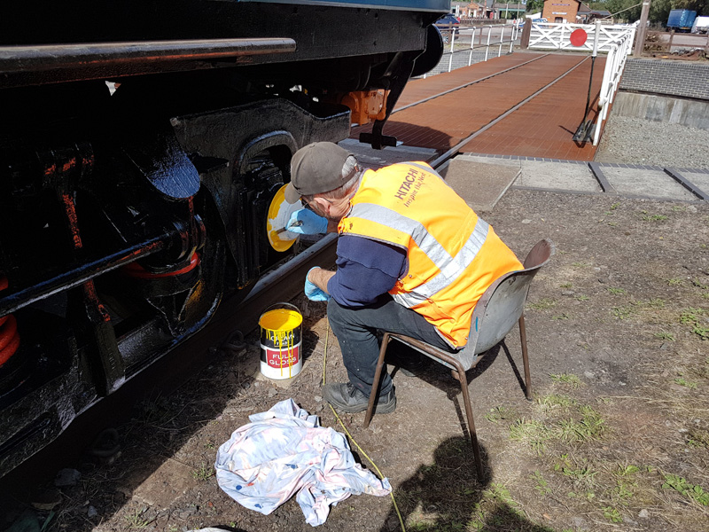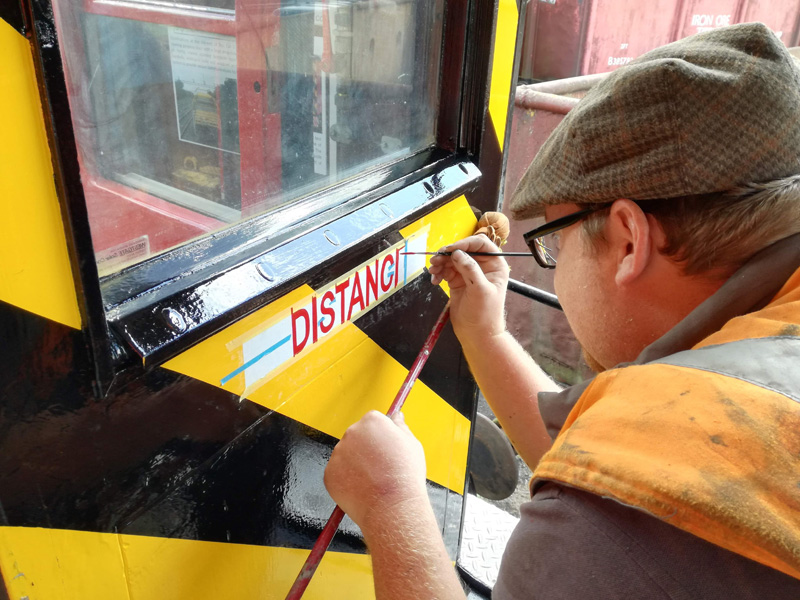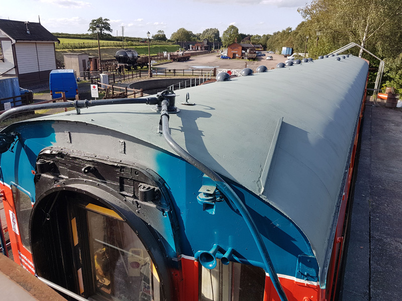 Welcome to another Quorn Wagon & Wagon update. This weekend has been of the hot, Bank Holiday variety which meant 3 days of shade seeking to keep cool. In between this, we’ve been working towards the completion of ‘2 car’ which is becoming tantalisingly close. Matt started by applying the coaches identification to the east side, while Jake painted the door shuts in Rail Blue. Nick and I cleaned, scraped and painted the ‘A’ End headstock, so we would be ready to colour code everything later in the weekend. Nick also took the black paint and touched in anywhere on the bogies that required more paint.