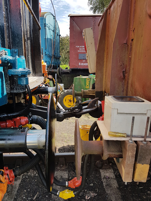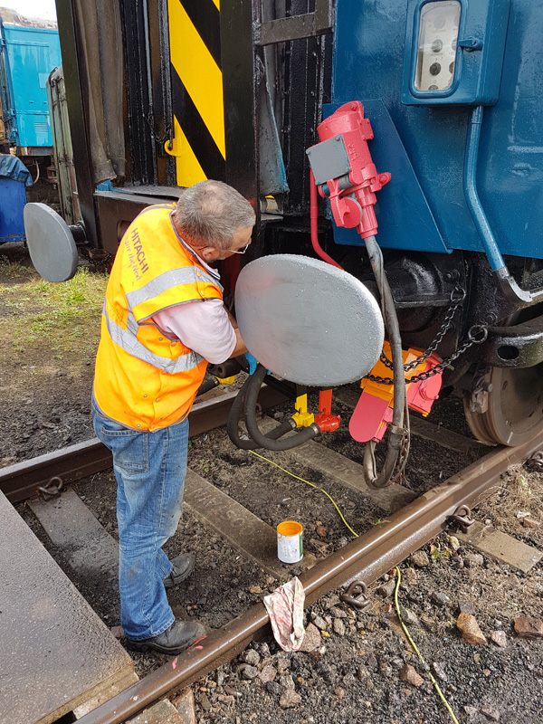I sanded the filler applied to the Slip end door, and then undercoated the door, ready for Warning Yellow Gloss. At some point in the future the Slip End door is going to have to be removed and planed down as it catches both the frame at the top and the floor, but for now, it can stay in place, especially as it won’t be opened regularly. Dave concentrated on the ‘B’ end where he cleaned and painted the headstock black. Matt also wire-brushed the OLEO buffers fitted to the slip end. We had planned to quarter them, however with the amount of wagons it has been coupled to, the buffers are quite scratched and to polish them will take quite a lot of work. These will be painted black in due course.