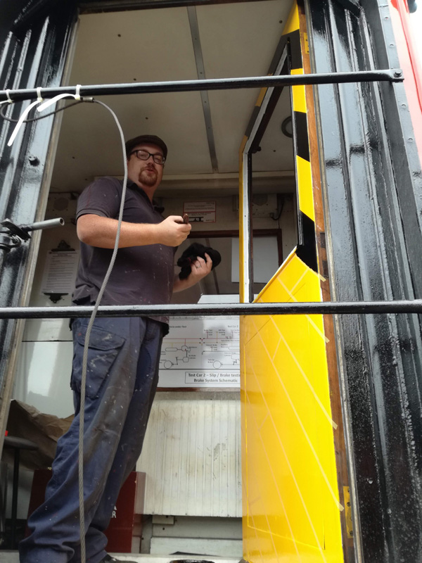 With the South End signwriting completed, Matt moved to the ‘B’ end sliding gangway door to paint it into undercoat for the Warning Yellow paint. Once completed, he then started the ‘B’ End signwriting.