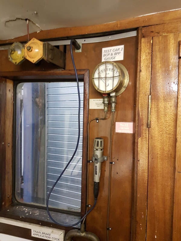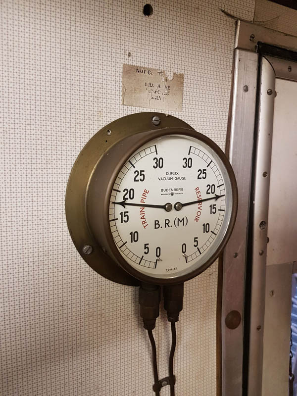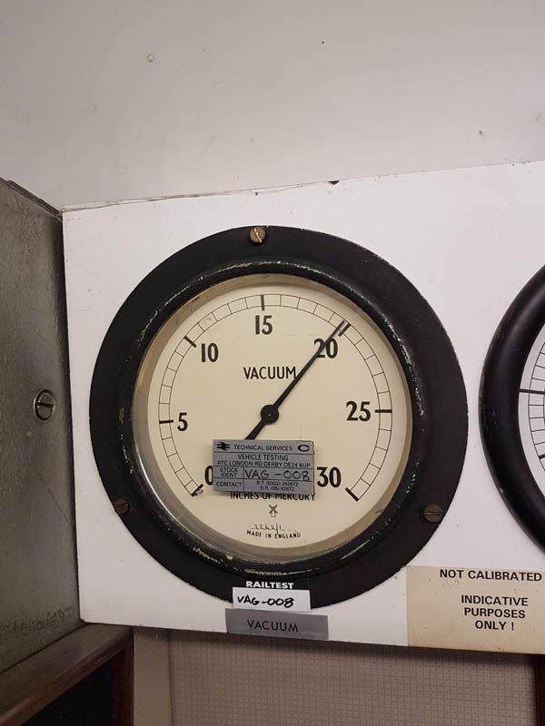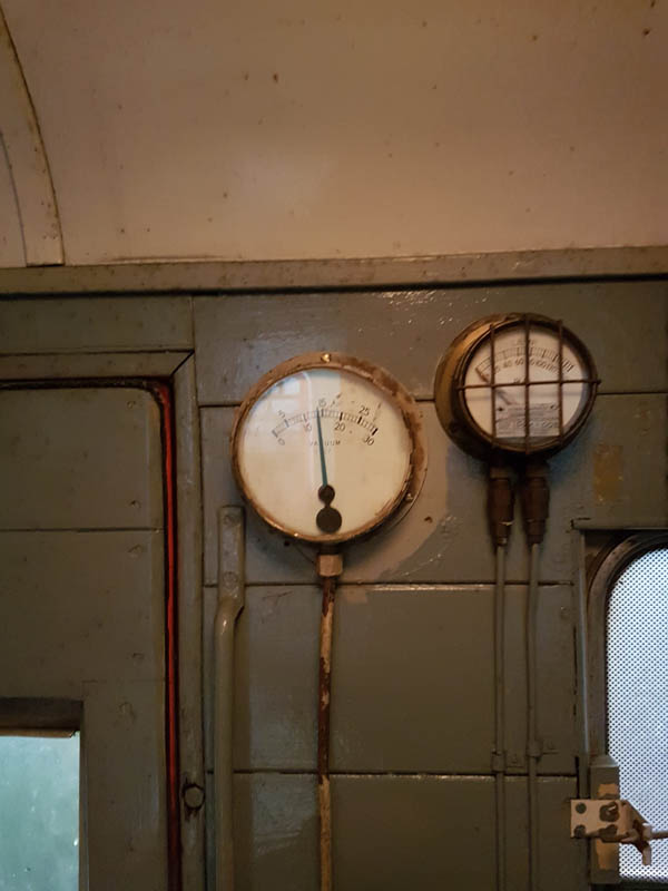 The final task for the whole weekend was to reinstate the vacuum hoses, again found in the tidy up.  Having looked under the vehicle we knew at this stage it would only be a through-pipe but the main reason for refitting the hoses was to check its integrity. With Rothley’s vacuum test rig wound up the gauges dotted around the vehicle began to raise.  As can be seen in the images below 20 inHg was attained, this was seen on all gauges. A duplex in the slip end, one in the main saloon and the Guards gauge which was installed moments before the test.