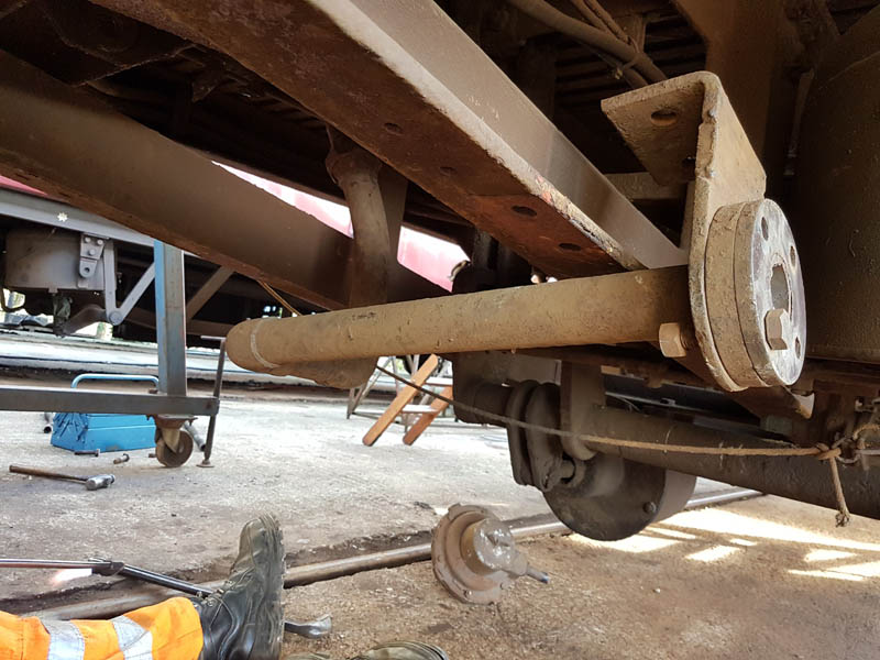 A ware plate was fitted, the spring pack then assembled and fitted and the recovered draw bar and hook was also fitted,  All four members of the team were required with some interesting contortions of people around the axles, bogie and pipework of the coach.